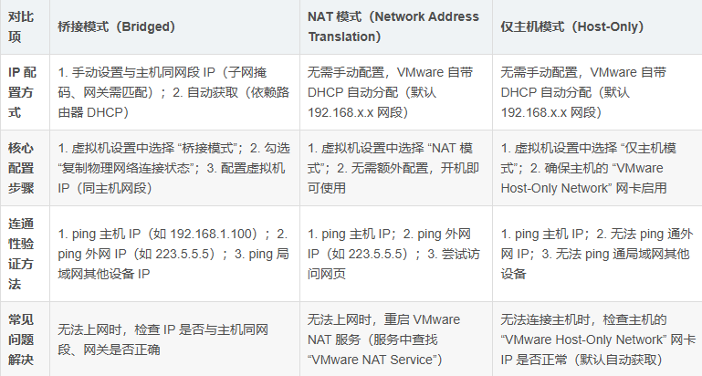 4.三种网络模式配置步骤对比表