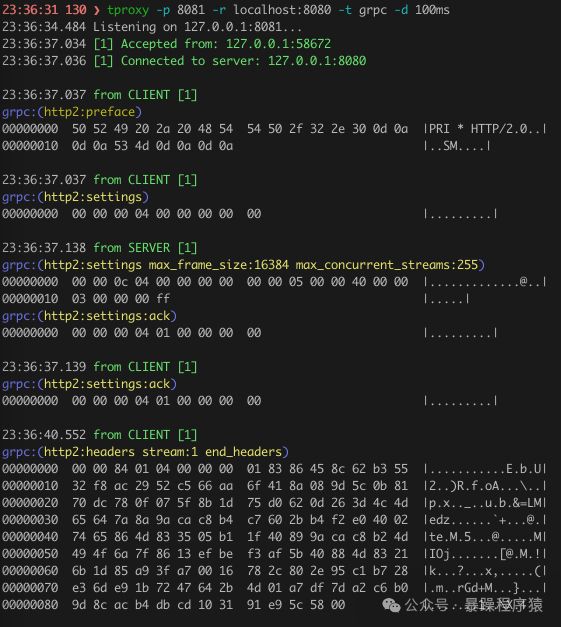 侦听在 localhost 和 8088 端口 重定向请求到 localhost:8081 识别数据包格式为 gRPC 数据包延迟100毫秒