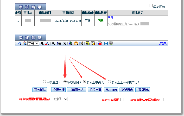 如果是申请人之后的第一个审核节点,则因为已经没有之前的审核人节点,所以不会看到以上两个选项,只能直接驳回至申请人,必须由申请人以复制驳回工作流申请、或者重新申请该流程的方式,重新发起申请。